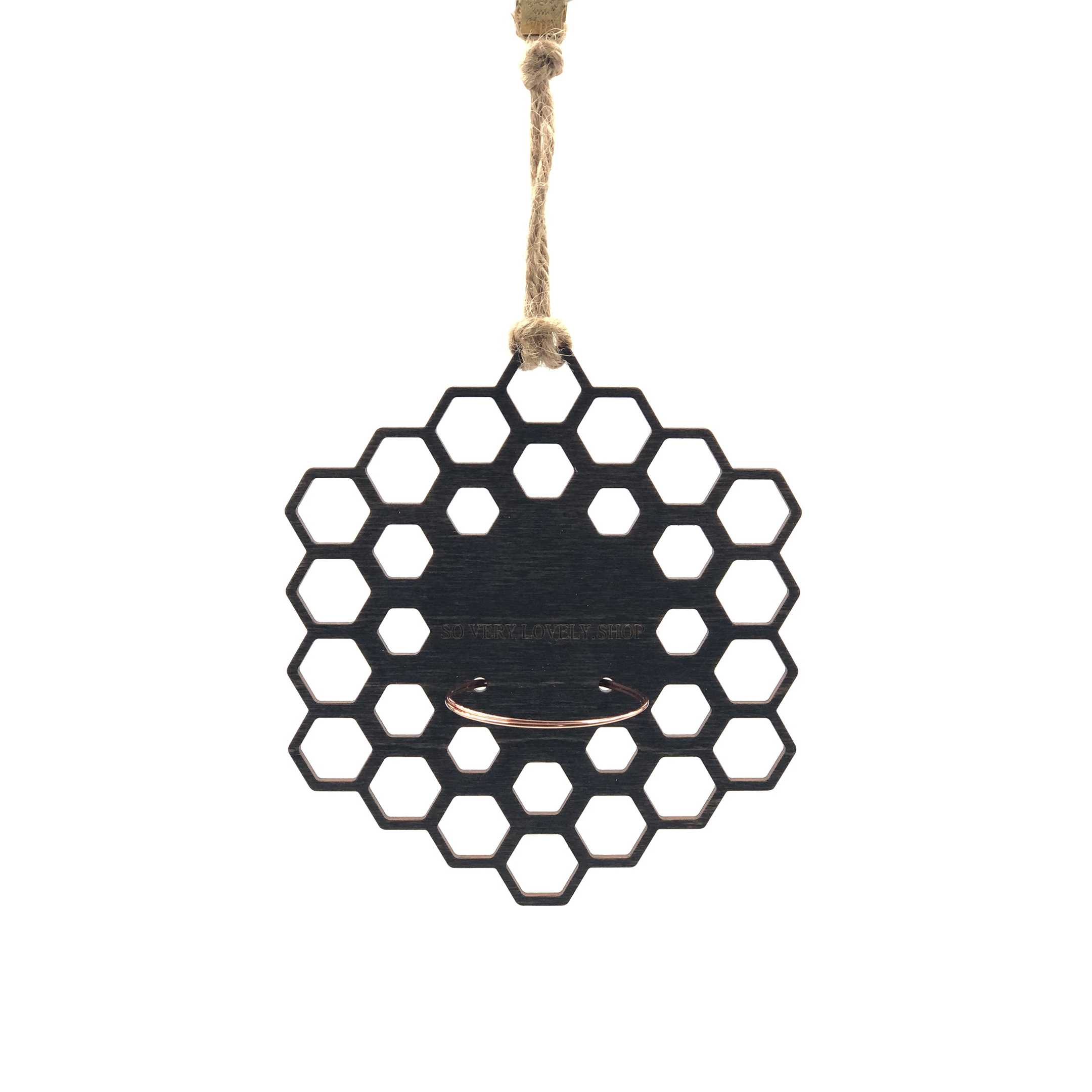 Materials: 1/8" Dark Grey Wood, Copper Wire, Jute String